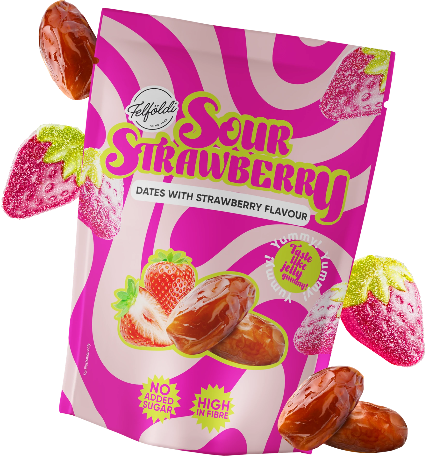 Magozott datolya 96,7 %, hidrogénezett kókuszzsír, inulin, savanyúságot szabályozó anyag: almasav; aroma.