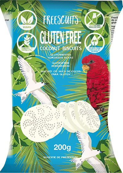 rizsliszt, burgonyakeményítő, édesítőszer: maltit; margarin [növényi olajok és zsírok (repce, kókusz, teljes mértékben hidrogénezett repce, napraforgó változó arányban), ivóvíz, emulgeálószer: zsírsavak mono- és digliceridjei; étkezési só, aroma, étkezési sav: citromsav; színezék: karotinok], ivóvíz, kókuszzsír, kukoricakeményítő, kókuszliszt (5,7%), tápiókakeményítő, kókuszreszelék (2,1%), burgonyapehely (100% szárított burgonya), térfogatnövelő szer: ammónium-hidrogénkarbonát; aroma, zselésítő anyag: nátrium-alginát; útifűmaghéj, étkezési só, emulgeálószer: napraforgó lecitin; kristályvanillin.